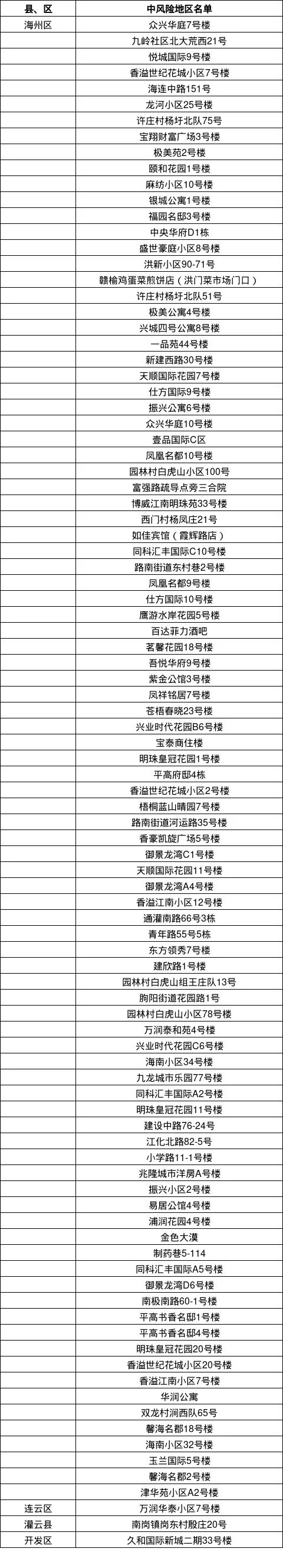 海州區(qū)潤琦苑3號(hào)樓、天景美地4號(hào)樓、溫僑綠苑B2由中風(fēng)險(xiǎn)地區(qū)調(diào)整為低風(fēng)險(xiǎn)地區(qū)。