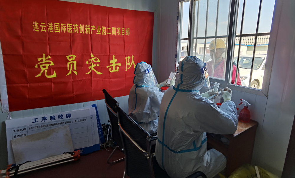 “請(qǐng)大家保持一米線,戴好口罩,有序參與核酸檢測(cè),謝謝配合!”來(lái)自市級(jí)重大項(xiàng)目連云港國(guó)際醫(yī)藥創(chuàng)新產(chǎn)業(yè)園二期項(xiàng)目黨員突擊隊(duì)的成員席時(shí)棟、陳家輝喊道。據(jù)悉,該項(xiàng)目目前按照上級(jí)相關(guān)規(guī)定,實(shí)行閉環(huán)管理,做好相關(guān)疫情防控工作?!拔覀冺?xiàng)目部嚴(yán)格按照市、開(kāi)發(fā)區(qū)相關(guān)規(guī)定,做好閉環(huán)施工,疫情防控、項(xiàng)目建設(shè)兩手抓、兩手硬?!眮?lái)自集團(tuán)棚戶區(qū)改造裕源三期項(xiàng)目負(fù)責(zé)人青年黨員徐震說(shuō)道。