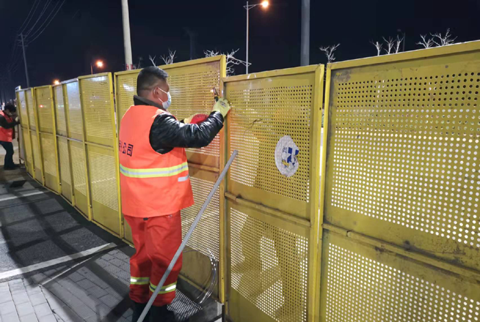 疫情就是命令,防控就是責(zé)任,容不得半刻的拖沓。3月5日晚,市政分公司接到圍擋安裝工程任務(wù)后,該公司黨員骨干8名突擊隊(duì)員第一時(shí)間趕到新區(qū)方洋路、環(huán)保十路相關(guān)路口。突擊隊(duì)克服夜晚視線不好、氣溫較低等客觀困難,加班加點(diǎn)進(jìn)行圍擋安裝,歷經(jīng)大家3個(gè)多小時(shí)的突擊工作,完成安裝任務(wù)。連日來(lái),面對(duì)肆意襲來(lái)的疫情,工作人員白天黑夜連軸轉(zhuǎn),任勞任怨,無(wú)怨無(wú)悔,放棄中午休息,路邊解決餐飲,在每一個(gè)時(shí)間節(jié)點(diǎn)按時(shí)完成各項(xiàng)安裝任務(wù),工作人員用汗水筑起“防疫鐵壁”,讓疫情“無(wú)路可逃”。