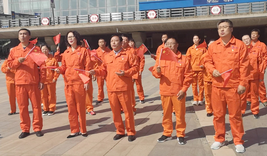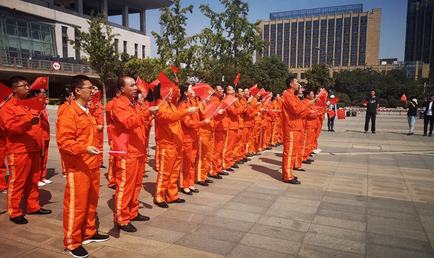 活動現(xiàn)場,身著亮橙色工作服的華茂員工,人手一面紅旗,不少青年員工在臉上身上貼上各式小紅旗,眾多圍觀群眾和往來旅客紛紛被氣氛感染自發(fā)加入宣傳隊伍,共同唱起《我和我的祖國》,大家臉上洋溢的不只是自豪,更是努力干事創(chuàng)業(yè)的動力。