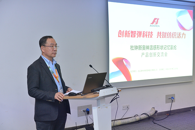 交流會上,杜鐘氨綸研發(fā)部曾登部長就奧神溫感形狀記憶氨綸的開發(fā)背景、產(chǎn)品特性以及應(yīng)用前景作了深入解析。參會嘉賓在對溫感形狀記憶氨綸有了較為清晰的認知和了解后,圍繞該產(chǎn)品的功能特點并結(jié)合自身產(chǎn)品開發(fā)方向,展開了一場智慧碰撞,對溫感形狀記憶氨綸的創(chuàng)新應(yīng)用提出了獨到的建議和暢想。