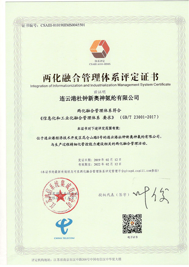 近年來,氨綸公司全面實施生產(chǎn)過程精細化管控,并積極申報兩化融合管理體系貫標,取得了優(yōu)異成績。近日傳來喜訊,氨綸公司順利通過評定機構的評審并被授予“兩化融合管理體系評定證書”。
