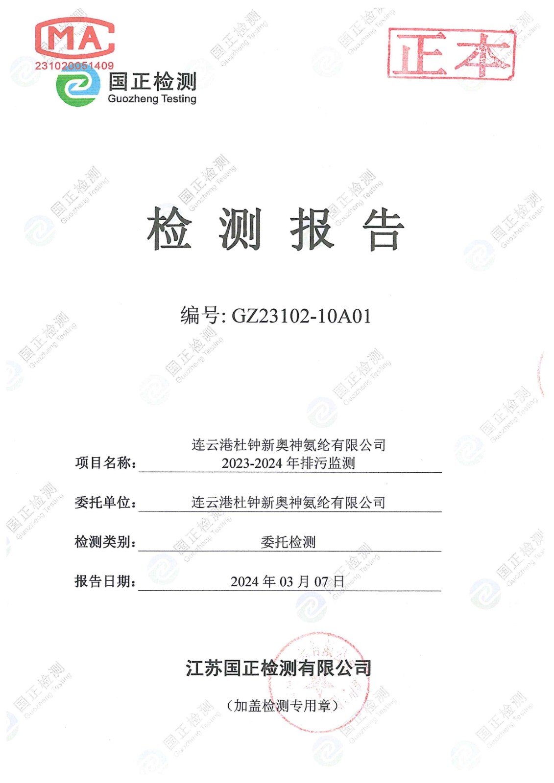杜鐘氨綸2月檢測 23102-10A01杜鐘年排污檢測報告