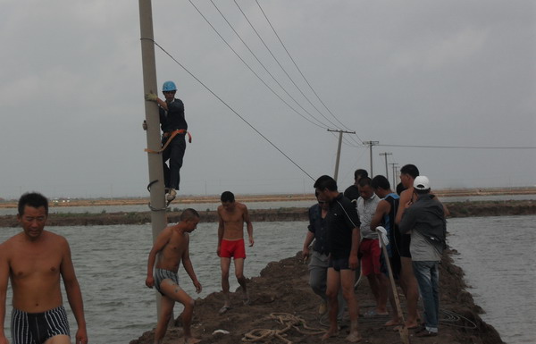 8月2日21時(shí)30分,“達(dá)維”在鹽城陳家港鎮(zhèn)登陸,帶來狂風(fēng)暴雨。所轄供電范圍比鄰陳家港鎮(zhèn),臺風(fēng)造成電力設(shè)施損壞,多條10KV線路停電。該所啟動(dòng)重大氣象災(zāi)害應(yīng)急預(yù)案,全所職工在崗待命搶修, 8月3日凌晨3時(shí)30分有全部到崗工作。4時(shí),職工分頭對線路進(jìn)行巡視檢查,在第一時(shí)間發(fā)現(xiàn)故障點(diǎn),以便搶修。該所主要領(lǐng)導(dǎo)主動(dòng)與重要客戶聯(lián)系,及時(shí)掌握情況,組織人員搶修。廣大搶修職工不怕困難,不怕疲勞連續(xù)作戰(zhàn),盡快恢復(fù)和保證生產(chǎn)生活用電,發(fā)揮了供電人特別能戰(zhàn)斗的精神。由于電桿倒在水中,給立桿帶來了困難,大家主動(dòng)脫去衣服,跳入到半腰身的水中搶修,有的解線,有的打拉線,個(gè)個(gè)干得一身汗,一身泥。