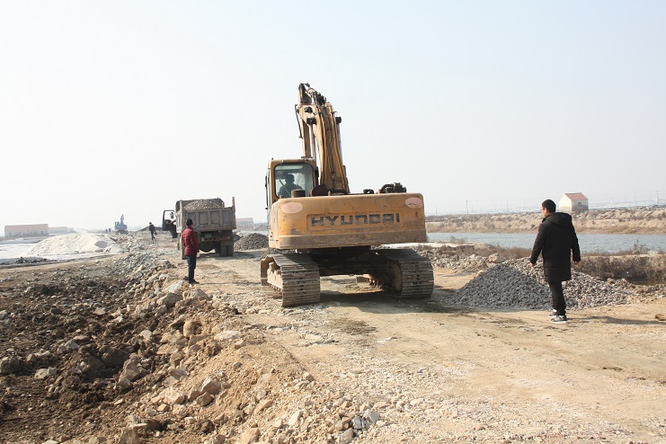 2月15日,在新河制鹽公司七至十班運(yùn)鹽路施工現(xiàn)場(chǎng),我們看到南翼公司項(xiàng)目工程分公司的員工正在指揮兩臺(tái)小型工程車(chē)將石子傾倒在路基上,兩臺(tái)挖掘機(jī)正忙于將運(yùn)送來(lái)的石子整平。運(yùn)鹽河對(duì)面,三輛滿載土夾石的大型工程車(chē)一字排開(kāi),正等待卸載。據(jù)了解,目前正在施工的是新河制鹽分公司二期運(yùn)鹽路維修改造工程,該工程改造路段全長(zhǎng)3300米,計(jì)劃總投資193萬(wàn)元,其中路基鋪設(shè)部分由日曬制鹽公司出資45萬(wàn)元,路面部分則由縣交通局承擔(dān),預(yù)計(jì)需要投入148萬(wàn)元。該工程于去年底開(kāi)始施工,預(yù)計(jì)三月中下旬全部鋪設(shè)完成。另外新河制鹽分公司一期一至十二班3300米運(yùn)鹽路改造工程計(jì)劃將于今年下半年實(shí)施。