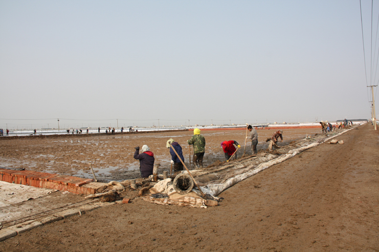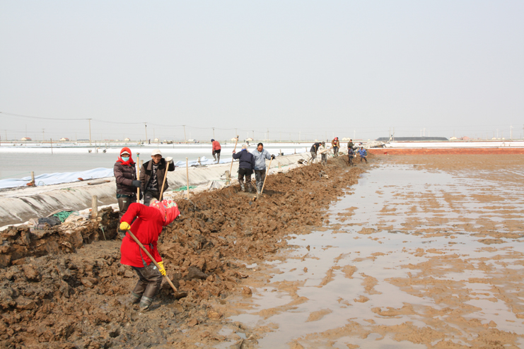 3月21日,在新河制鹽分公司八班的一期結(jié)晶區(qū),一片火熱景象,只見大家正在灘內(nèi)揮膀大干,挖泥的、和泥的、打堰的,配合密切,運作熟練,參加勞動的職工足有50余人。“為了加快食用原料海鹽基地建設進度,今天,我們集中了7個組班的員工幫助八班維修下馬格格堰,爭取早日灌池生產(chǎn)。”正在工作現(xiàn)場安排工作的該公司經(jīng)理安樹林說道。