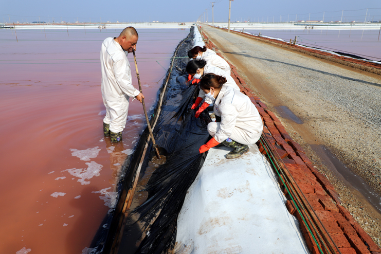 趁著休息的間隙,筆者與身邊忙得滿頭大汗的8班班長祝星星聊了起來。據(jù)祝星星介紹,每天員工4點半就到灘頭,進行鹽池的人工活碴、稟基修復、鹽池鹵水補充、收放設備檢查等一系列工作,因此,合理安排工作量非常重要。他告訴筆者,室外工作工人的勞保服比較厚,一天下來工作服濕了又干,干了又濕,衣服上都泛出厚厚的鹽漬。一天下來,全班要消耗2大桶甚至更多的飲用水?,F(xiàn)在公司里對我們一線生產(chǎn)崗位員工非常關心,防暑降溫工作非常到位。最近,單位又為我們發(fā)放高溫津貼、電風扇、防暑降溫藥品。這些讓我們員工真切感受到組織的力量,組織得偉大,所以雖說現(xiàn)在比平時更辛苦,我們有信心戰(zhàn)高溫、奪高產(chǎn)。