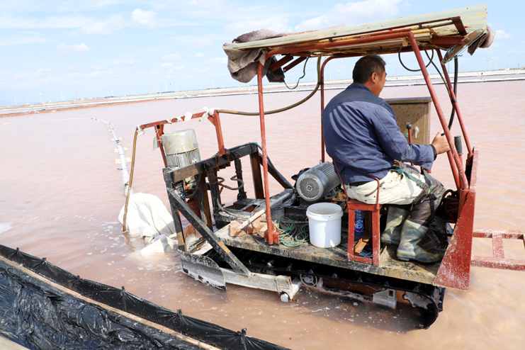 筆者在走訪時(shí)看到,在新河制鹽分公司10班的鹽池內(nèi),一臺(tái)輕型自吸式電動(dòng)履帶“T30”正在進(jìn)行帶鹵扒鹽,大池道上抽鹽機(jī)泵的轟鳴聲回蕩在鹽灘上,不遠(yuǎn)處另外幾個(gè)扒鹽機(jī)組也在不停的忙碌著。