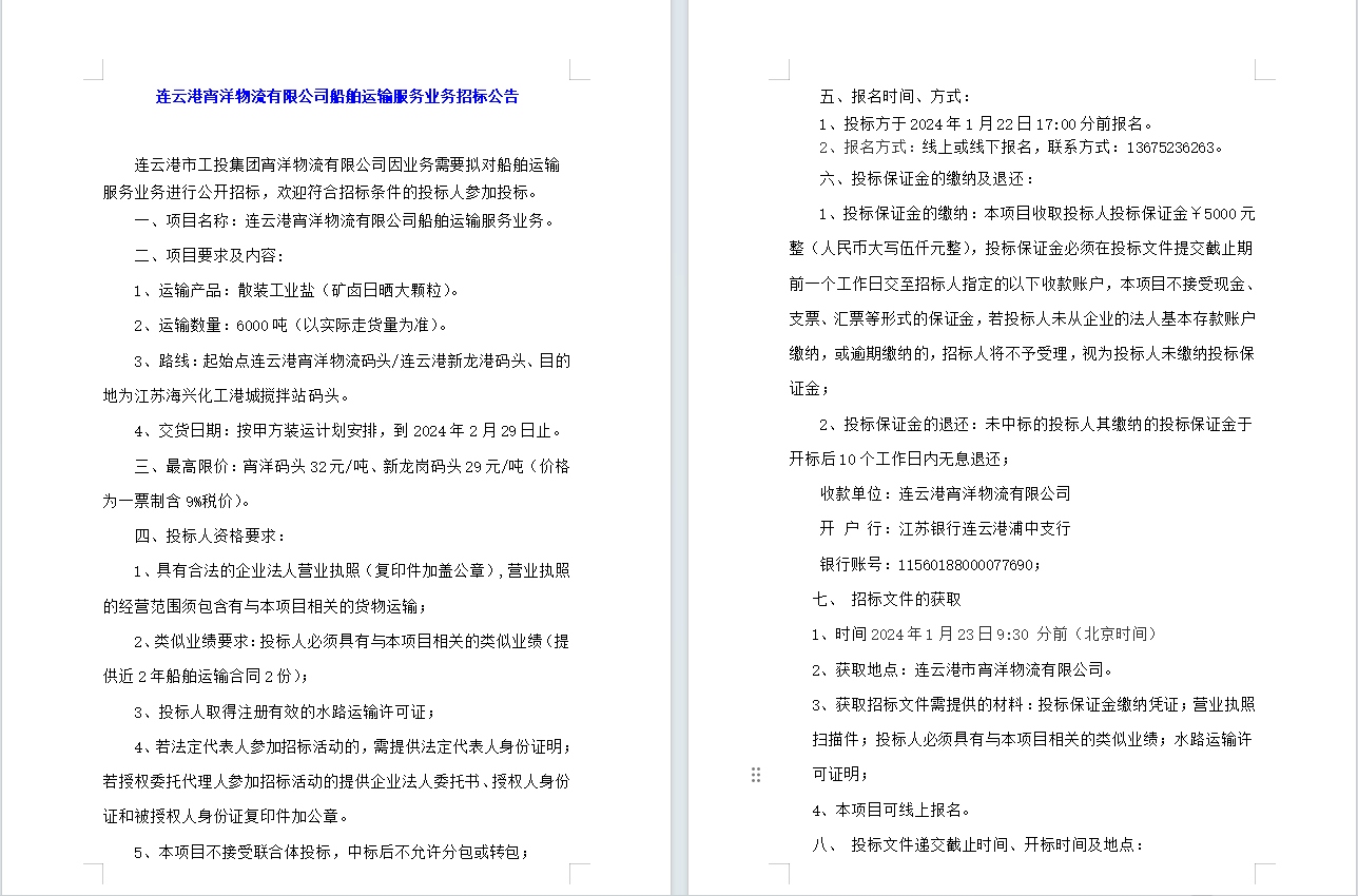 連云港宵洋物流有限公司船舶運輸服務(wù)業(yè)務(wù)招標公告