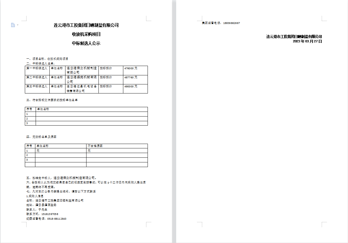 連云港市工投集團(tuán)日曬制鹽有限公司收放機(jī)采購項(xiàng)目中標(biāo)候選人公示