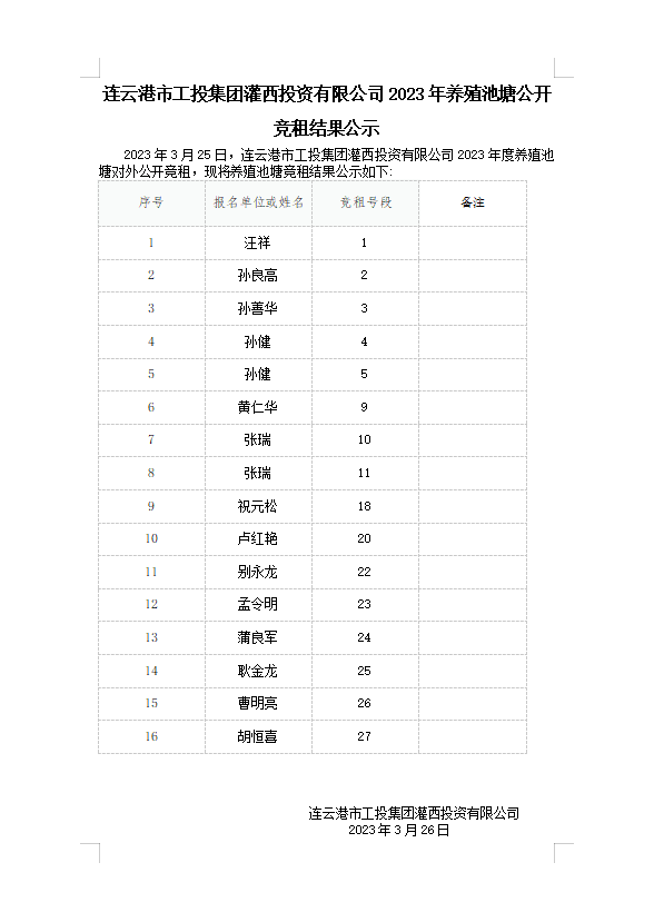 連云港市工投集團(tuán)灌西投資有限公司2023年養(yǎng)殖池塘公開競租結(jié)果公示