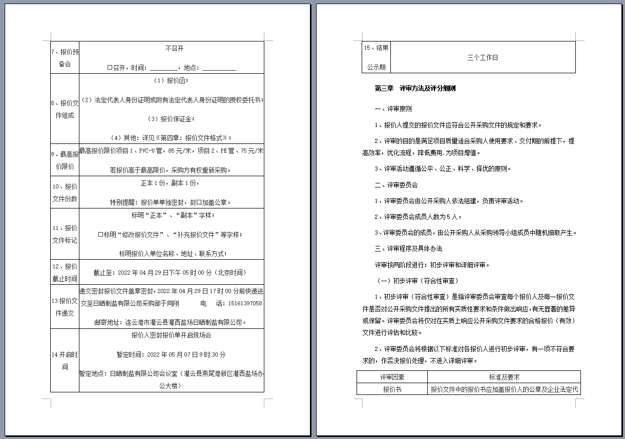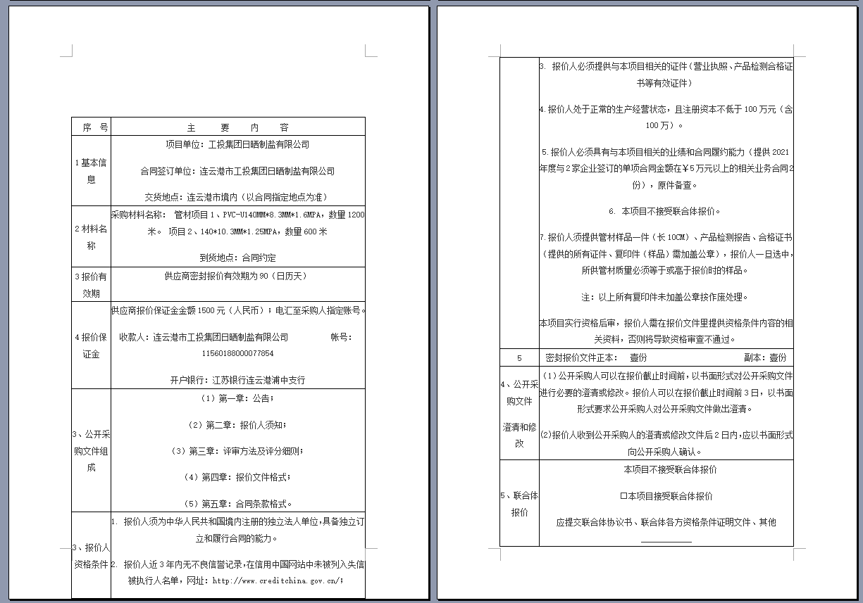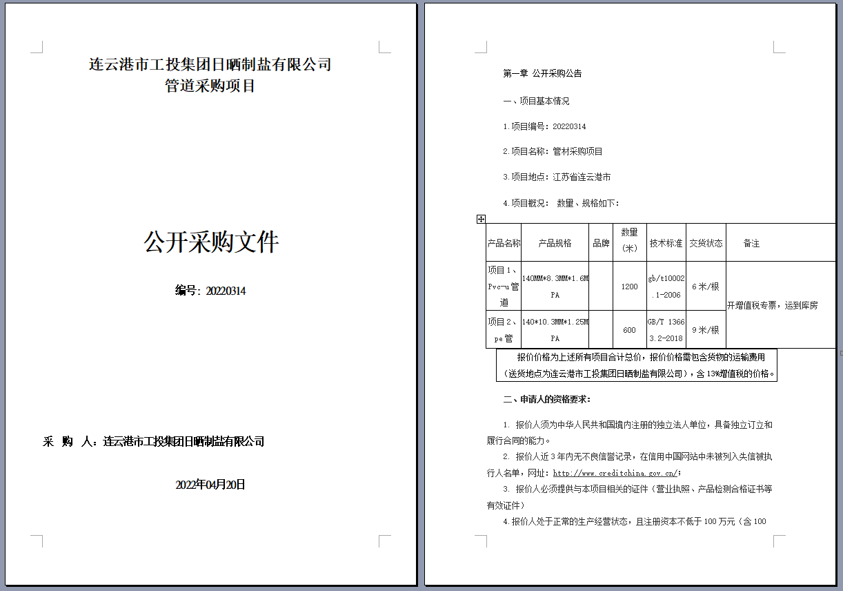 連云港市工投集團(tuán)日曬制鹽有限公司管道采購項(xiàng)目 公開采購文件