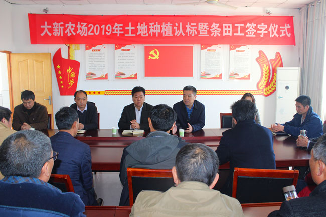 為序時推進農業(yè)生產,確保各項生產工作快速啟動, 3月22日上午, 公司舉行大新農場 2019年土地種植認標暨條田工簽字儀式,公司總經(jīng)理史祥平、副總經(jīng)理周緒祥出席。