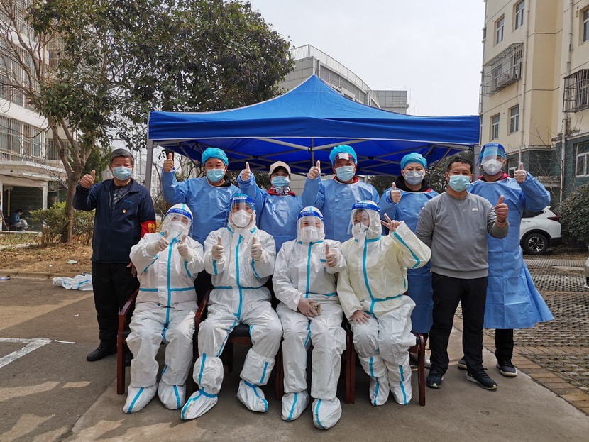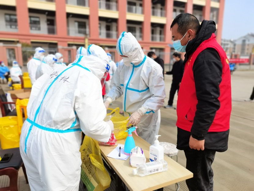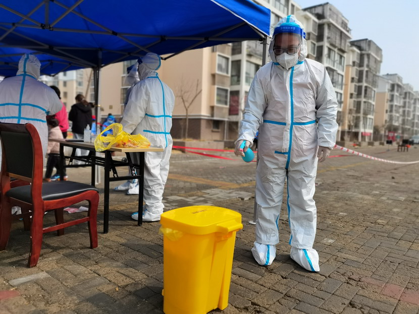 清晨6點30分,1號檢測點,李明同志在檢查物資,“大白”服裝4套、“小藍”服裝6套、棉簽600根……;2號檢測點,于洪亮在將物資上桌,病毒核酸檢測試管、棉簽、消毒液,“還缺少一瓶酒精,我立即反饋給社區(qū),請社區(qū)抓緊安排送來”;4號檢測點,蘇玲、秦黎明正在互相幫忙穿好防護服,“秦姐,這個防護面罩里外有兩層薄膜,我給你撕掉,這樣就不會有霧氣了”,“嗯嗯,你這個拉鏈得拉到頂,我們自己也一定要做好防護”秦黎明溫柔的說;5號檢測點,內退黨員孫芳和姜海洋,互相在防護服后背寫上對方的名字,以便于更高效的完成檢測工作;6號檢測點,霍正鋼、朱文健、韓永剛、邱榮濱正在清點檢測小卡片;7號檢測點,張強在拿著酒精給廢物處置垃圾箱消毒;8號檢測點,新加入的孫銀、占恒春、尹永明、韓永光、趙紹慶正在給消殺噴霧劑灌裝84消毒液,社區(qū)8個檢測點的消殺工作全部由昌圩臨時黨支部志愿者負責。