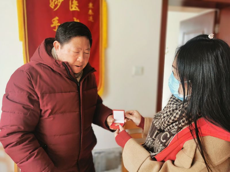 為老黨員送上學(xué)雷鋒紀(jì)念章