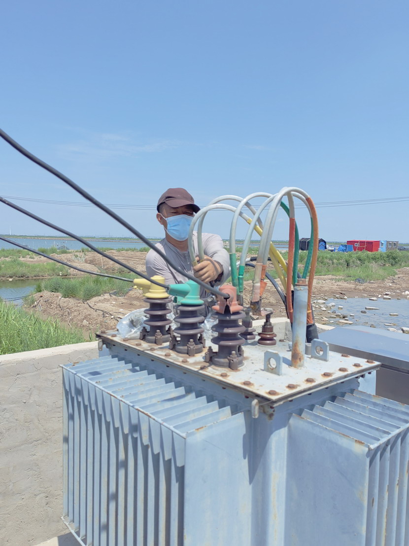 10時40分搶修工作全面展開,當天地下氣溫接近38度,塔臺上氣溫接近50度,變壓器上燙的要命,人在上面只是感覺熱浪滾滾,電工尹永明身上衣服很快被汗水濕透,太陽暴曬,如火的驕陽絲毫沒有阻擋施工進度,一切工作都進行的繁忙有序,井井有條。中午12時30分經過近2個小時的搶修,工作人員完成了變壓器的維修任務,保證了魚塘用電設備的正常運轉。