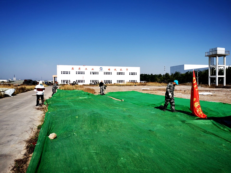 全體工作人員頂著烈日對黃土裸露區(qū)域進行覆蓋。大家分工明確,有條不紊,一邊清理廢棄垃圾,一邊小心謹慎的扯著防塵網(wǎng)布與迎面吹來的大風沙土博弈。大家不怕臟、不怕累,個個奮勇爭先。經(jīng)過半天的辛苦勞動,就完成了近萬平方的露天黃土覆蓋工作。放眼望去,一片“綠草茵茵”,看似不可能完成的任務在大家的同心協(xié)力下順利完工,自豪和喜悅油然而生。