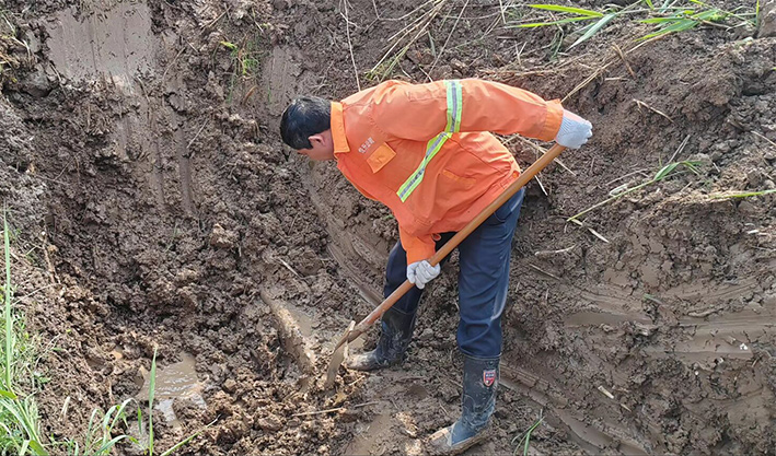 市政分公司組織搶修人員迅速到場(chǎng),調(diào)集挖機(jī)與搶修材料,有序開展應(yīng)急搶修。維修人員首先對(duì)漏水管道實(shí)施開挖,經(jīng)過維修人員仔細(xì)挖開后確定直徑110PVC管道老化導(dǎo)致管道連接端裂開。查明原因后,制定了相應(yīng)可行的搶修方案。搶修過程中,大伙不畏困難、分工有序,相互協(xié)作,在滿是泥濘的坑中開展維修作業(yè)。機(jī)械開挖、人工配合清淤、更換損壞管道、增設(shè)哈夫節(jié)等一系列的步驟,一通操作下來,搶修人員人人汗流浹背。經(jīng)過3個(gè)多小時(shí)連續(xù)奮戰(zhàn),高效完成此次搶修任務(wù)。