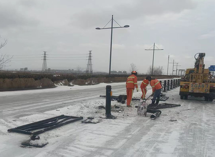 近兩日,因雨雪天氣,道路結(jié)冰濕滑,車輛行駛過程中發(fā)生意外,造成港前大道、海濱大道、228國道等地段發(fā)生多起道路護(hù)欄等設(shè)施損壞情況。收到信息后,市政分公司道路養(yǎng)護(hù)人員迅速反應(yīng),在班長孫寬成帶領(lǐng)下,隊(duì)員們頂風(fēng)冒雪第一時(shí)間趕赴現(xiàn)場。