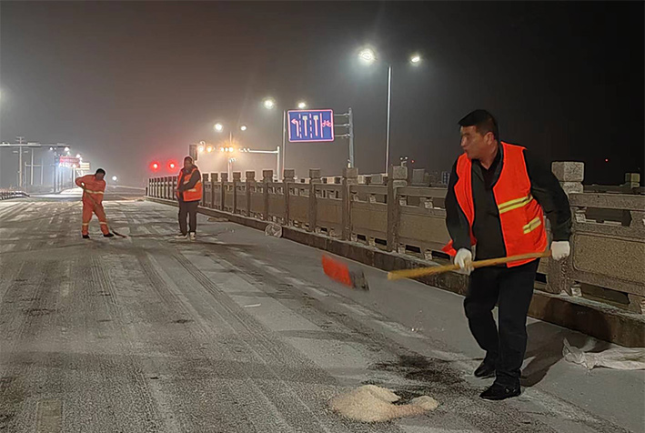 “下雪就是命令!”昨晚幾乎與降雪同步,板橋園區(qū)滿城“橘黃閃耀”。風雪中,瑞南人不畏嚴寒,堅守崗位,后勤保障加班加點,在連云園區(qū)燒香河大橋上,各班組人員協(xié)同作戰(zhàn),有指揮、有鏟雪、有拋灑融雪劑,他們揮舞鐵鍬、揮動掃把,全速進行掃雪除冰工作。截止19日凌晨兩點,燒香河大橋、程圩高架橋,上下引坡等交通要道區(qū)域積雪已基本清除完畢,其他路段正在有序清理。 (金知青)